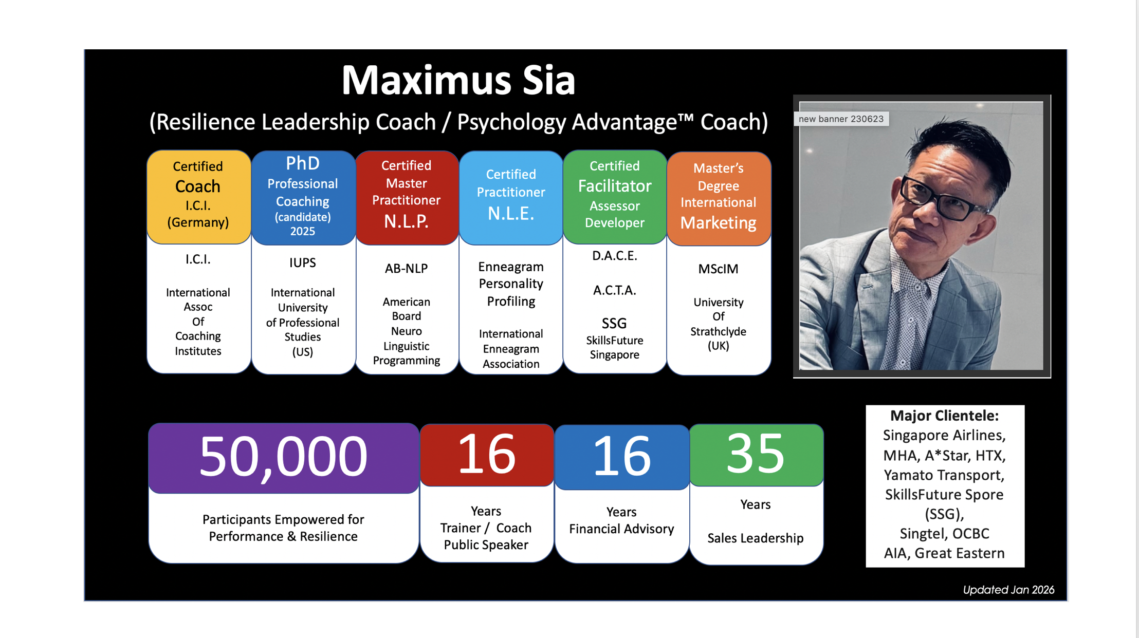 The MDX Resilience Program is a structured, applied psychology–based leadership development program designed to build core psychological capabilities through the integration of key practices from Neuro-Linguistic Programming (NLP), cognitive-behavioural Therapy (CBT), and Positive Psychology, delivering a multi-domain experience. It is a premium program under The Psychology Advantage™ in Leadership. BOOK NOW!“The MDX Multi-Domain eXperience Resilience Program™ is a proprietary framework designed to build resilience across multiple psychological domains – a trademarked program developed by [Maximus Sia/Maximus X Academy].”
